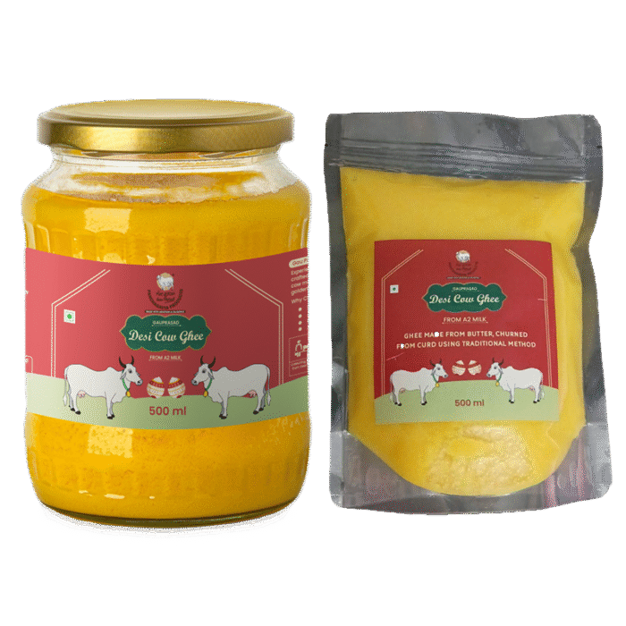 Desi Cow (A2) Ghee is prepared using traditional methods from the milk of Indian desi cows, renowned for their rich A2 protein content. This ghee is handcrafted in our gaushala, ensuring purity, nutrition, and a rich aroma that enhances the flavor and health benefits of your food.